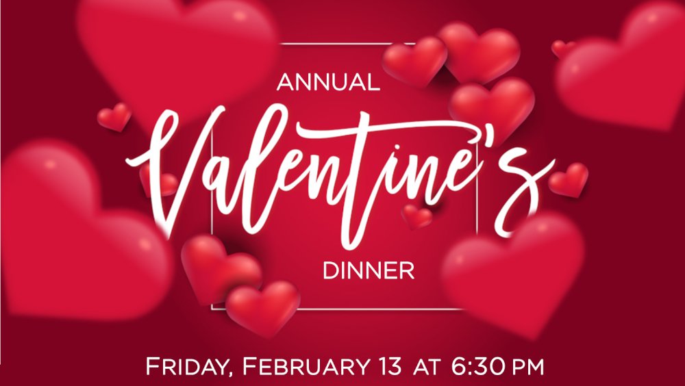 Mark your calendars and call the babysitter for Friday, February 13 at 6:30pm as we gather for an always-fun Annual Valentine’s Dinner!