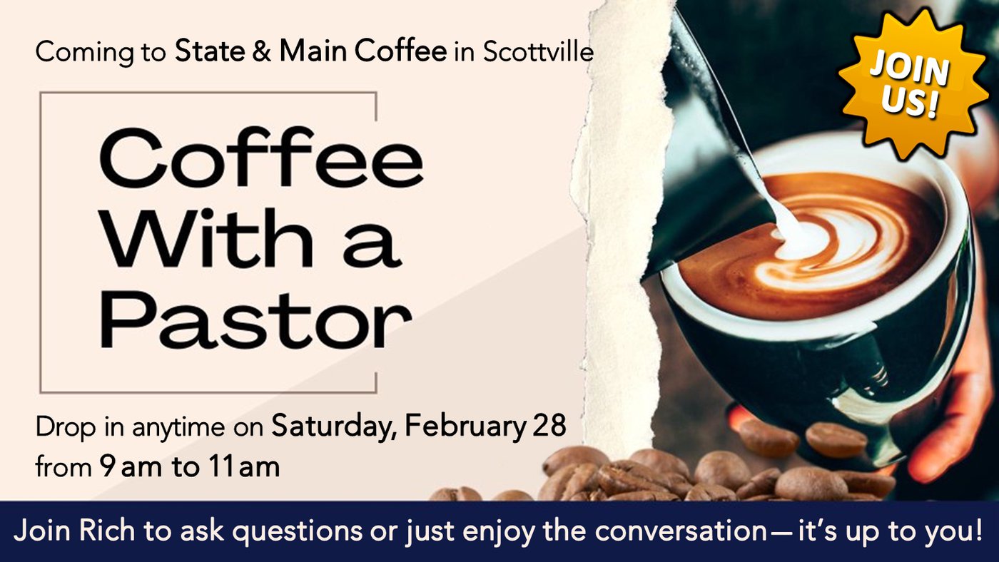 Pastor Rich will be at State & Main Coffee in Scottville on Saturday, February 28 from 9 to 11am. Drop in any time and join the conversation!